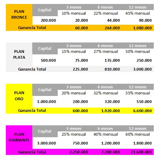2. Se dispone de 4 (cuatro) tipos de Planes de Inversión (Plan Bronce, Plan Plata, Plan Oro y Plan Diamante) con capital y montos establecidos que no podrán ser modificados ni alterados en ningún momento.